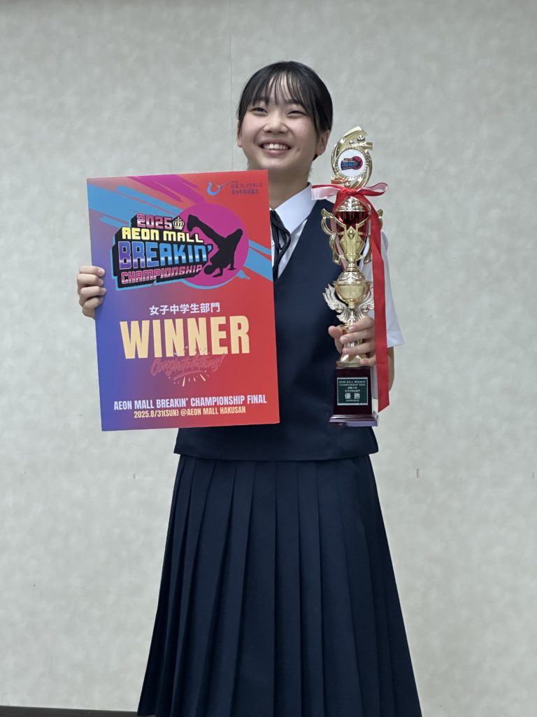 大仙市部活動報告会にて、日本ブレイキン協会が運営し全国11か所で行われたAEONMALL BREAKIN’ CHAMPIONSHIP 2025全国決勝大会 女子中学生部門にて、大釜莉乃選手(大仙市)が日本1を獲得したことを報告してまいりました。